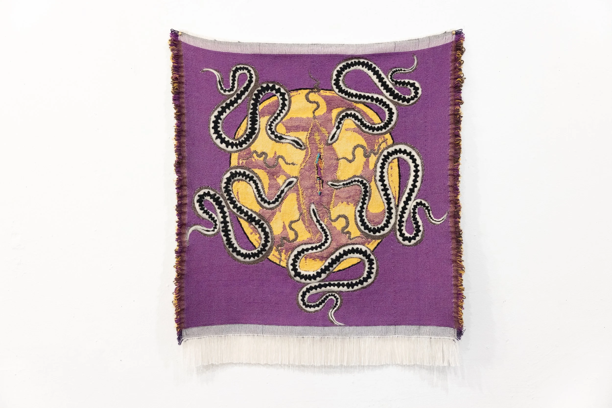 Mercerized cotton, shetland and merino wools, and silk, handwoven on TC2 loom with needle felting and embroidery embellishments
