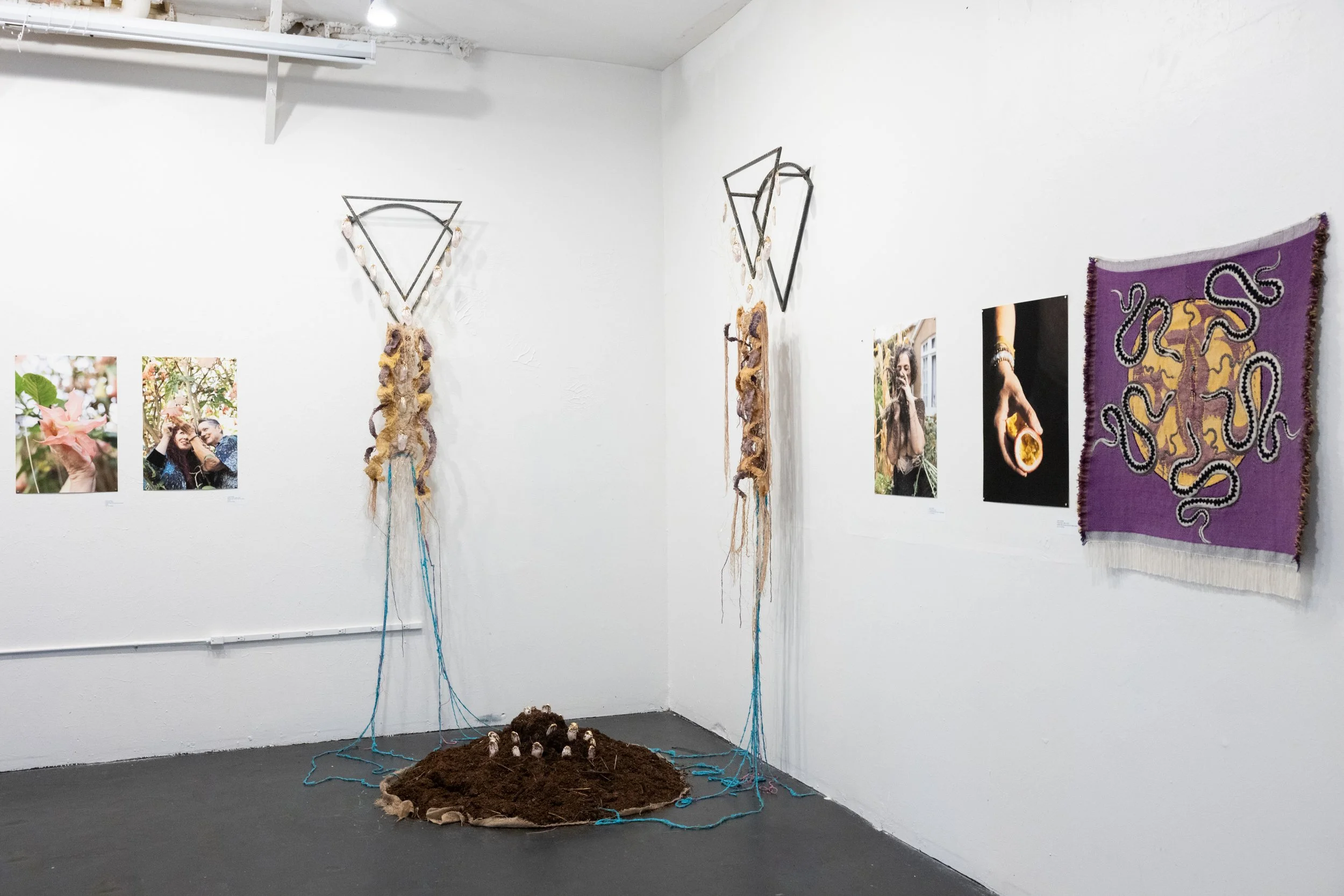Bronze studded steel bones, brass wire, flax paper pulp, hand spun fibers (linen, tussah silk, red eri silk, merino, mohair, and romney wools hand dyed with marigold, onion skins, eucalyptus, logwood, and cochineal, bamboo silk chemically dyed), commercially spun fibers (linen, merino, silk, mercerized cotton), ceramic amulets, compost, and tobacco