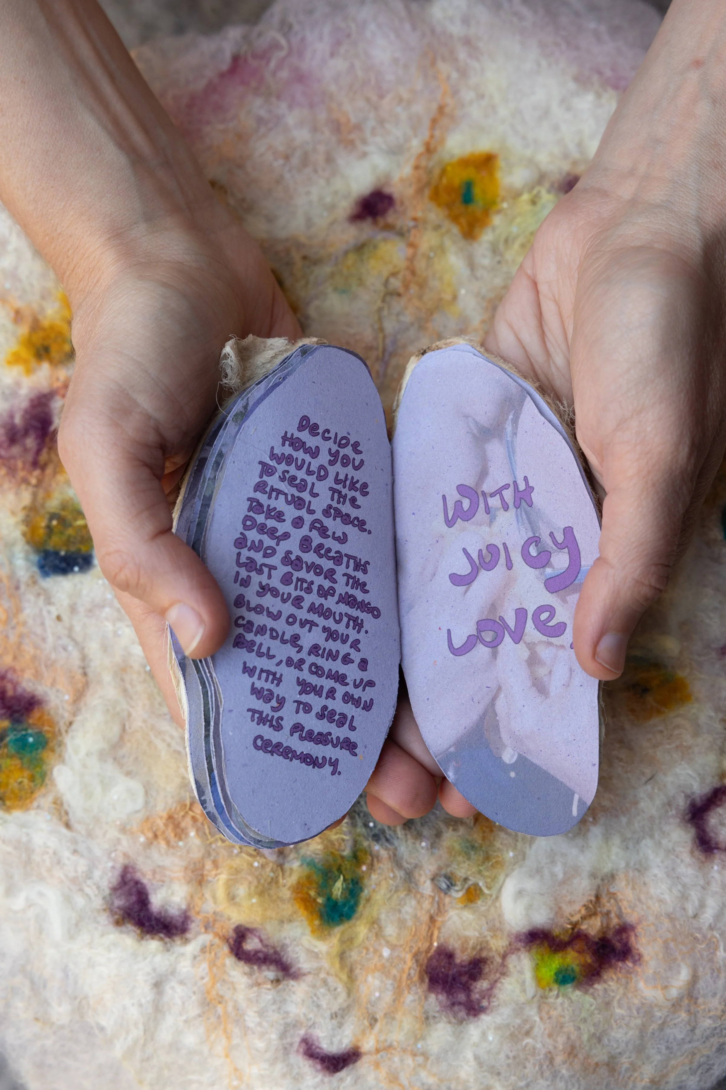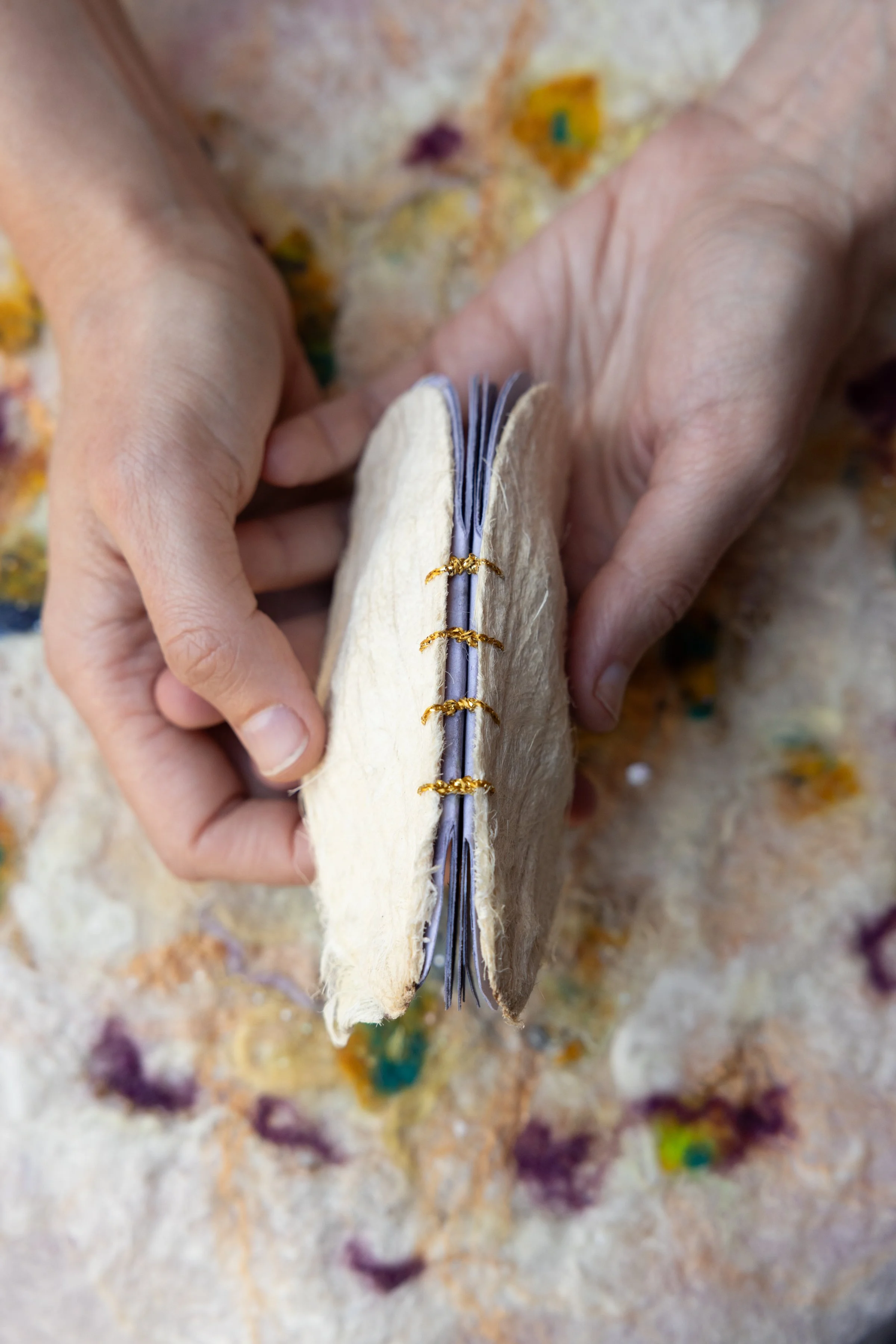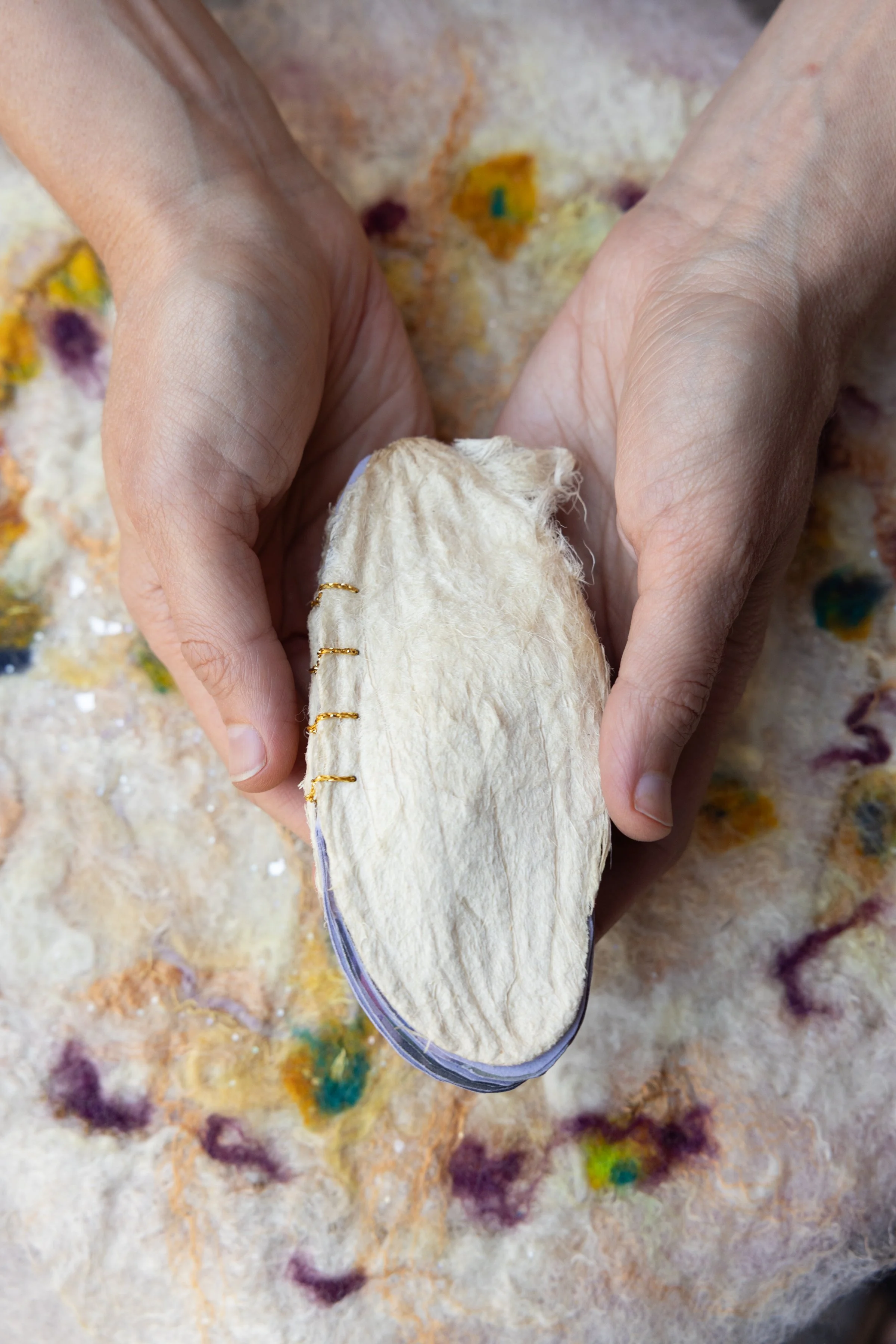 Dried mango seed coats, metallic embroidery thread, mx dyed merino and silk, handmade cotton and flax paper by Aidan Anne Frierson